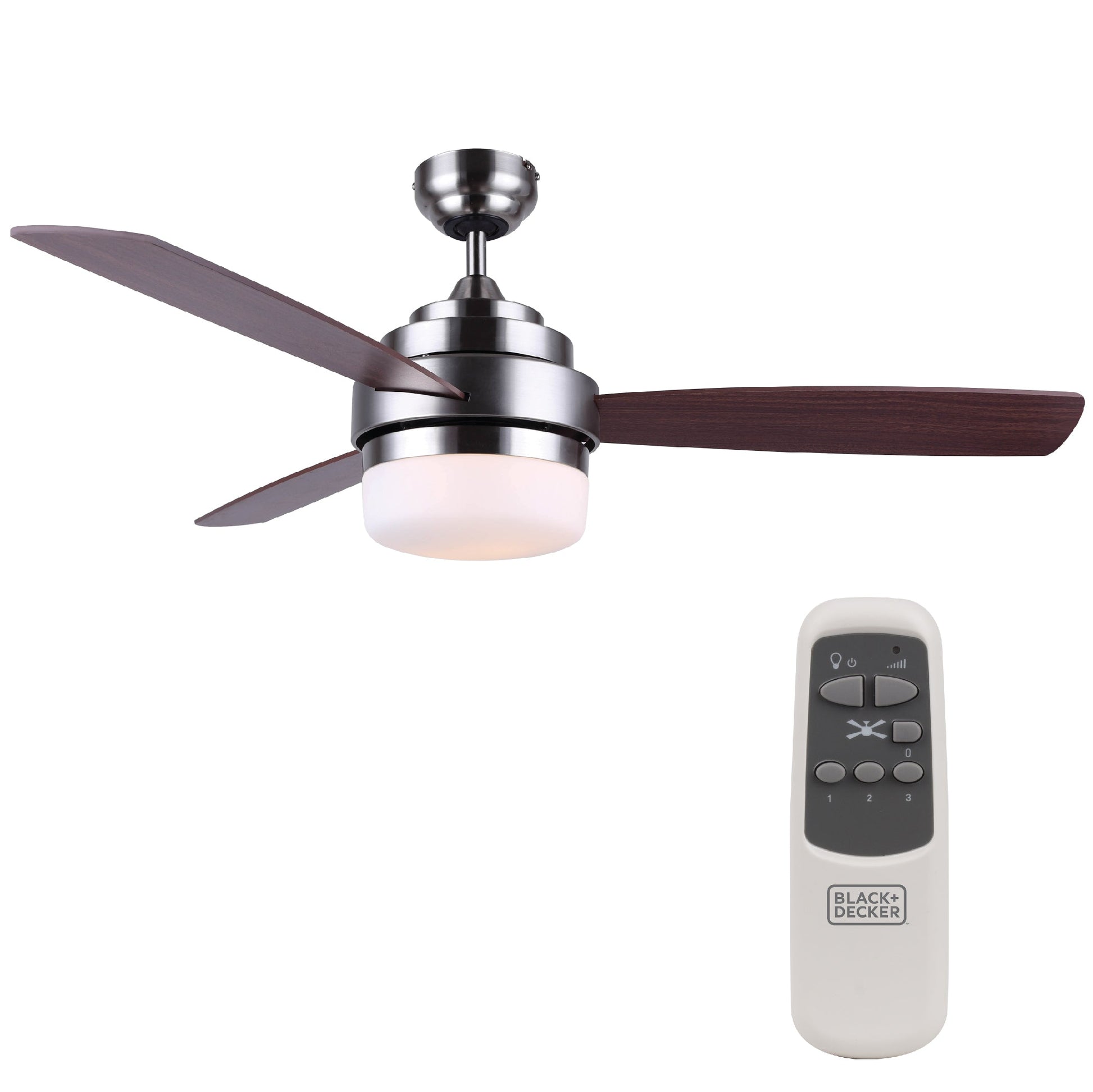 This BLACK+DECKER 52 inch ceiling fan with light will circulate air like never before. When it comes to quality ceiling fans, our attic fan (52" x 52" x 17.5") delivers powerful cooling thanks to impressive 3 reversible plywood blades in Mahogany and Natural Wood Finish. Choose your fan setting: HIGH (4800 CFM), MED (3360 CFM), and LOW (1920 CFM). Control your house fan with a convenient fan remote. Talk about ease! Our ceiling fan with lights remote control (15.4 lbs.) comes in a modern nickel finish, which is cool and contemporary, sure to delight many aesthetics. This brush nickel ceiling fan cools rooms up to 270 square feet quickly and efficiently. What's better than a 52 inch ceiling fan with light and remote for a hot summer day? This brushed nickel ceiling fan is easy to operate, stunning to look at, and powerful in its ability to cool a room. In the world of lighting & ceiling fans, this BLACK+DECKER 52 ceiling fan with light and remote control ceiling fan ranks among some of the best. Enjoy a frosty white light that can set the ambiance of a room with 2 13W E26 bulbs sold separately. Stay comfortable and breezy any time of year with BLACK+DECKER's brushed nickel ceiling fan with light and ceiling fan remote!