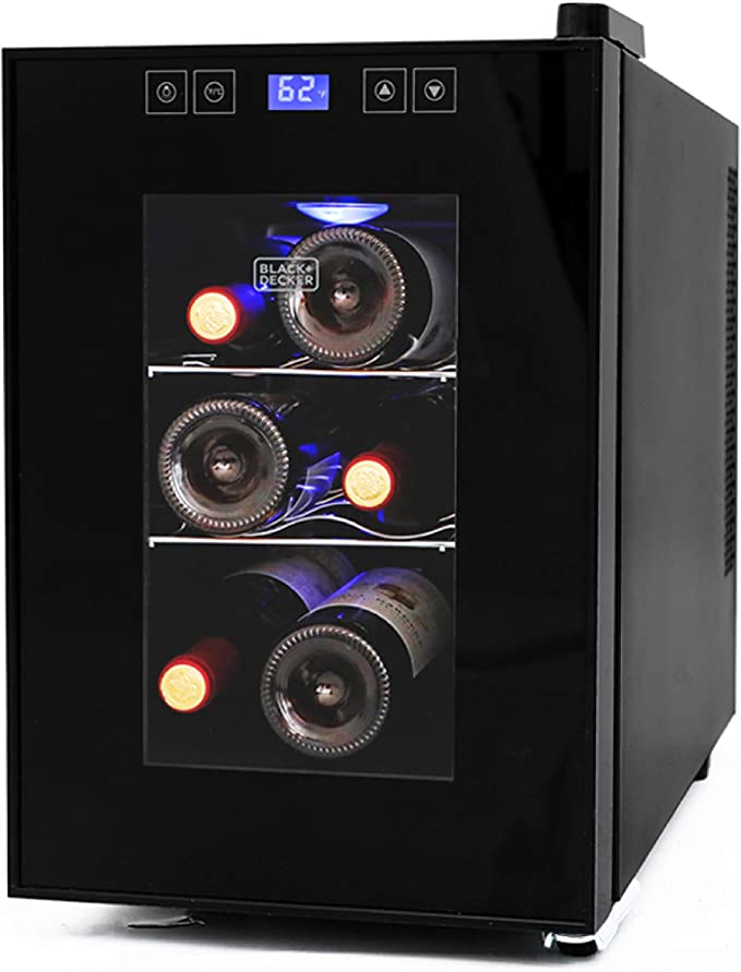 6 BOTTLE STORAGE: Store up to 6 bottles of your favorite vino with this 17.6-lb. space-saving small wine cellar. Our BLACK+DECKER small wine fridge (9.7" x 19.8" x 14.9") also includes 2 chrome full-length racks and convenient interior light.