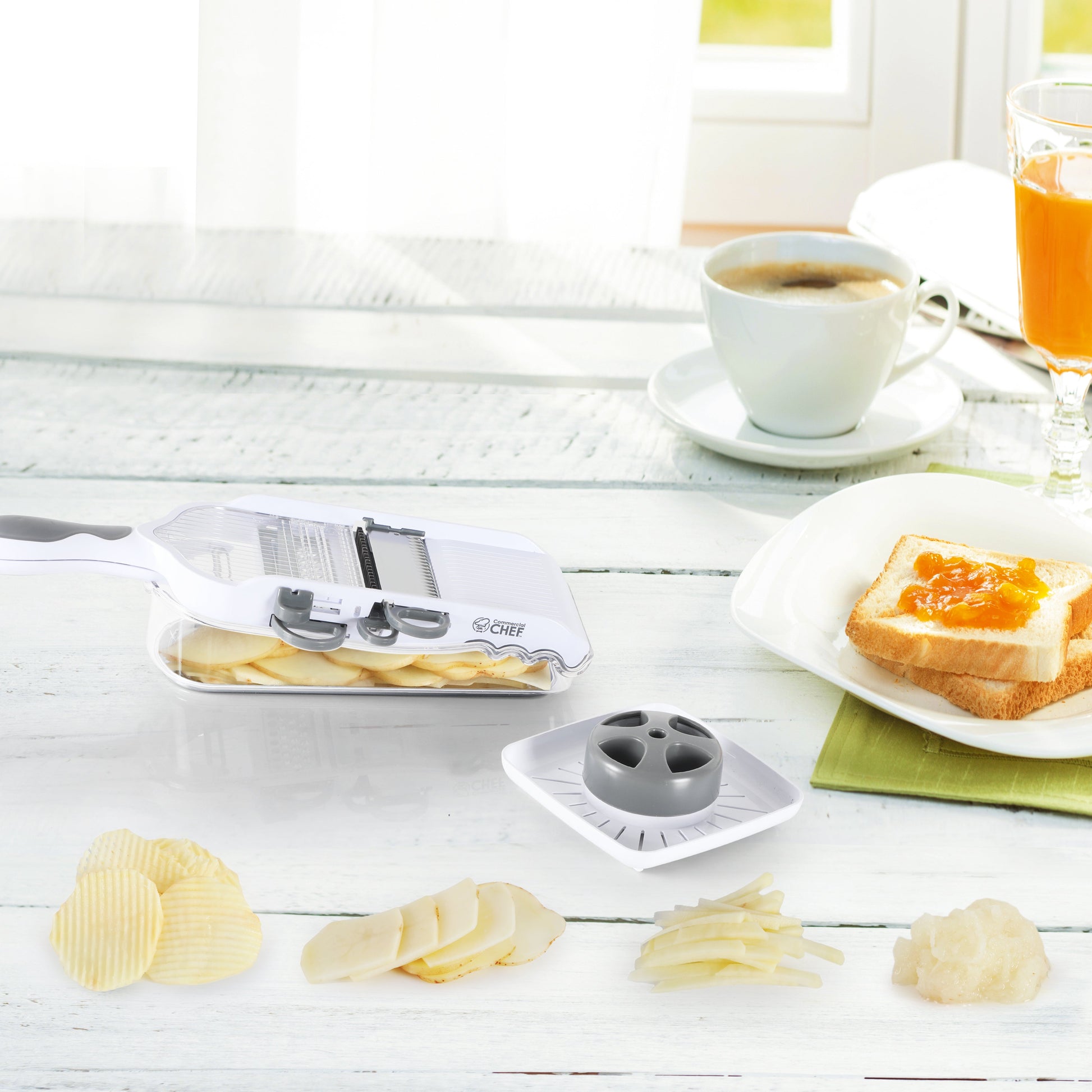 The four interchangeable blades allow you to prep meals and snacks easily and quickly. Using the hand guard slide carrots, onions, cucumbers, apples, tomatoes – even cheese – smoothly over the preferred blade for expertly prepared vegetables and fruits.