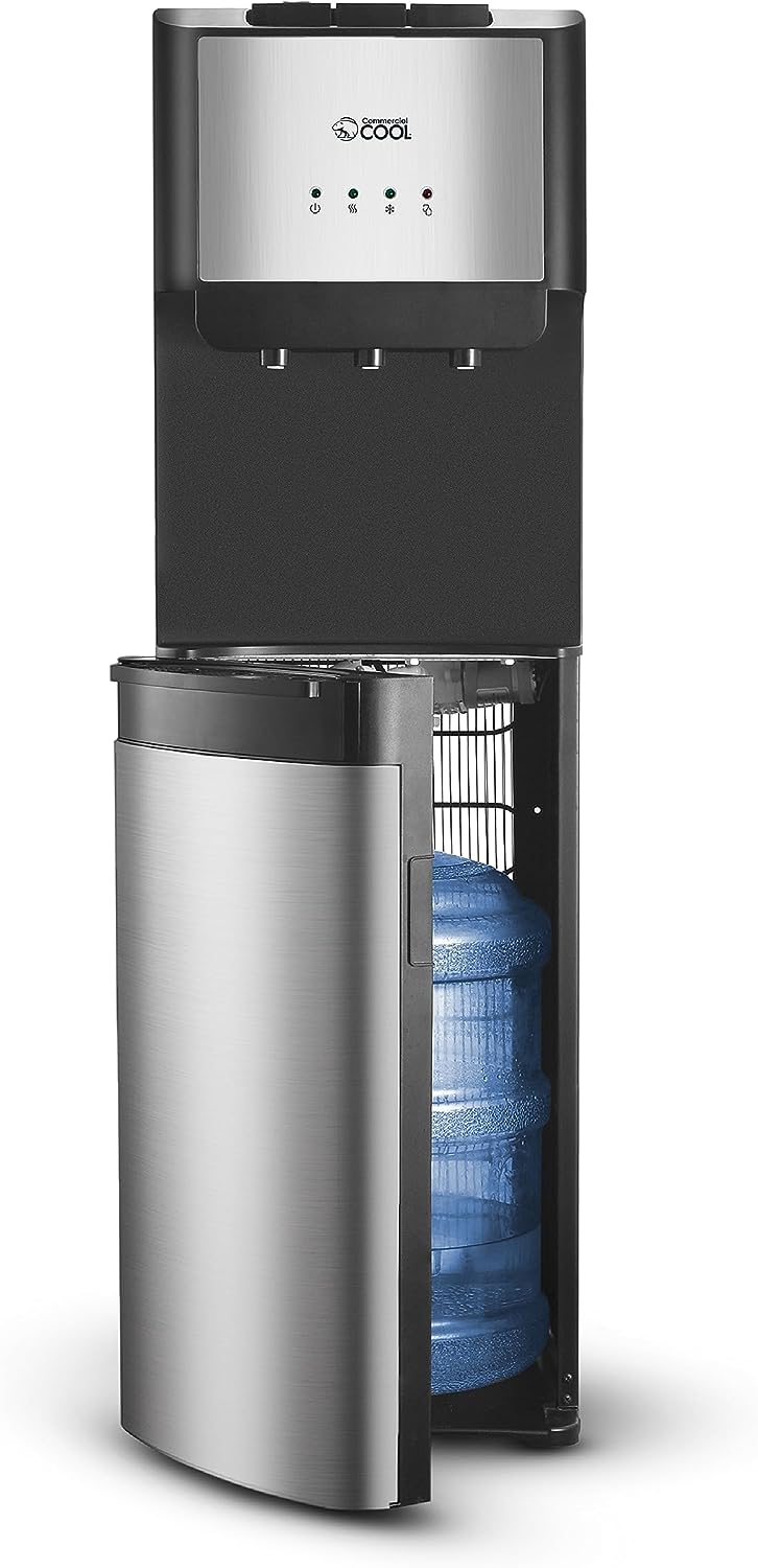 Commercial Cool Bottom Loading Water Dispenser, For 3 or 5 Gallon Water Bottle Jugs, Black with Stainless Steel Door & Trim, Push Button Controls, water cooler dispenses cold, hot or room Bottom